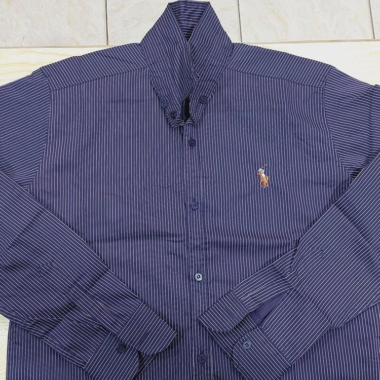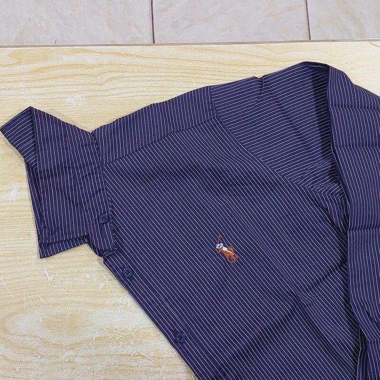 پیراهن مردانه راه راه بنفش با خطوط عمودی سفید در سایز های لارج و ایکس لارج و دو ایکس لارج و سه ایکس لارج، تولید شده در تولیدی های داخلی استاندارد و معتبر داخلی.
