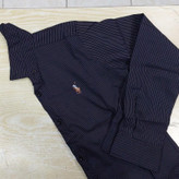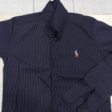 پیراهن مردانه راه راه طرح پلو در رنگ مشکی با خطوط عمودی بنفش تا یاسی درسایزهایL. XL. 2XL. 3XL