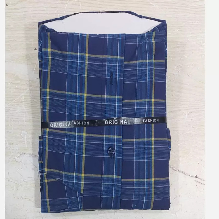 پیراهن مردانه چهارخانه با ترکیب رنگی آبی و سرمه ای و زرد ،سایز LوXL، تولید شده در تولیدی های داخلی استاندارد و معتبر کشور،مناسب آقایان خوش پوش.