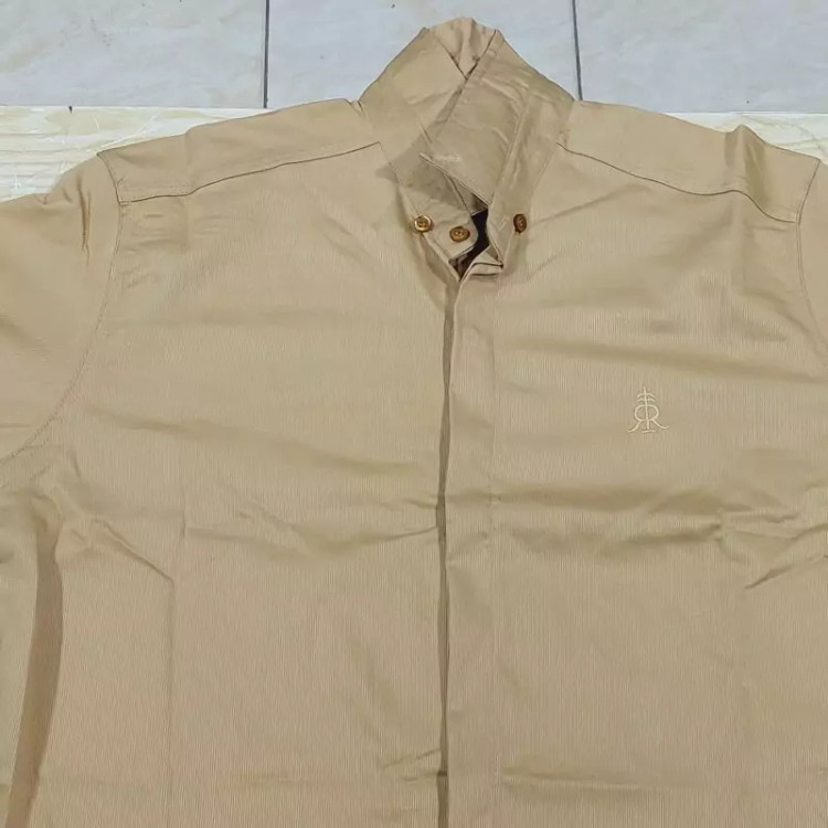 پیراهن مردانه رنگ کرمی پر رنگ تا شتری دکمه مخفی و کشی ، با حالت میله ای در سایز های لارج و ایکس لارج و دو ایکس لارج و سه ایکس لارج، تولید شده در تولیدی های داخلی معتبر، مناسب آقایان خوش پوش.